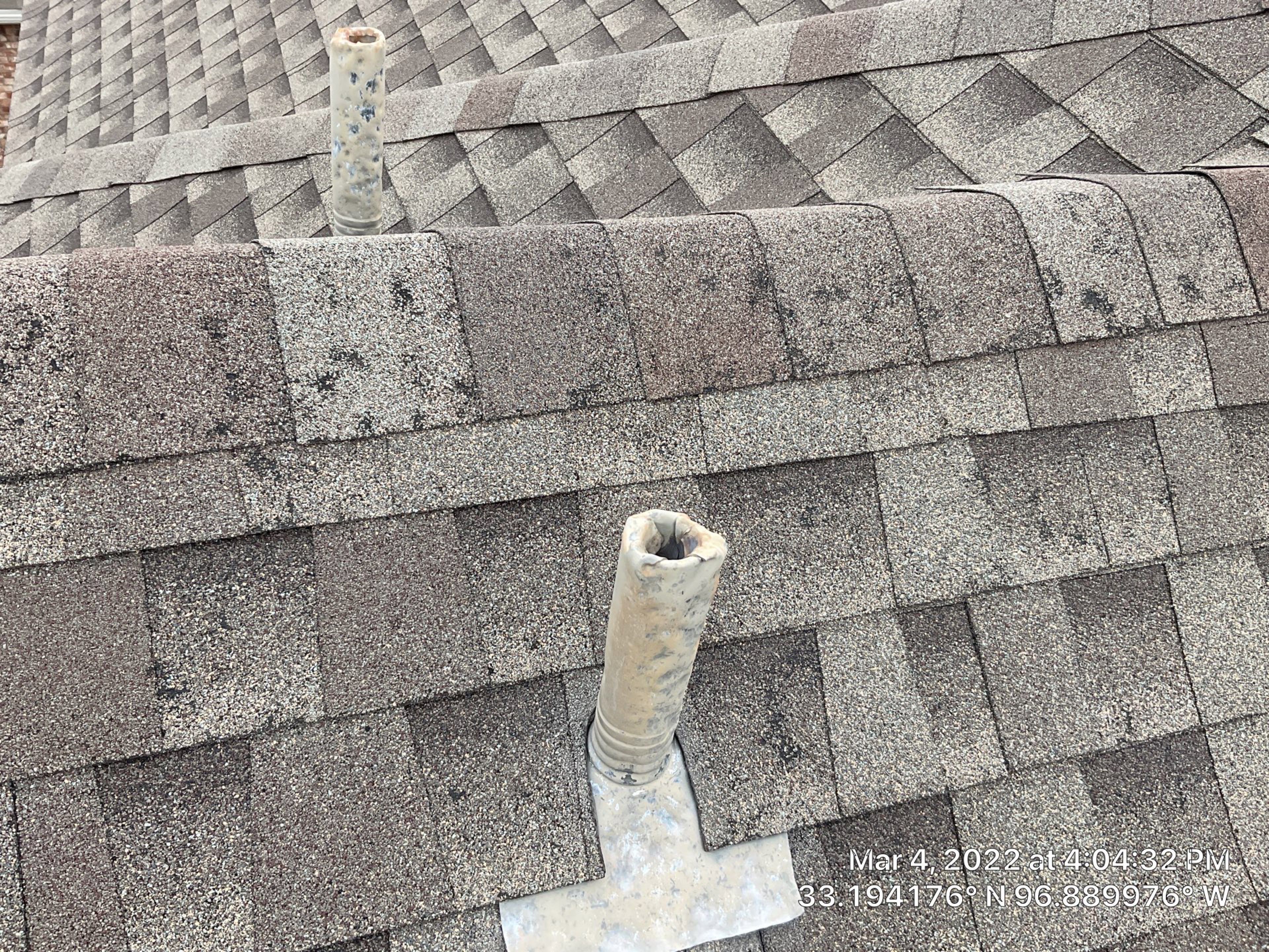 Not all damage is visible from the driveway. On this McKinney property, we walked the entire roof checking flashing, pipe boots, ridge vents, and shingle condition up close. Found soft spots near the chimney the homeowner had no idea about. We put together a photo report so they could see exactly what needed attention before it turned into a leak.